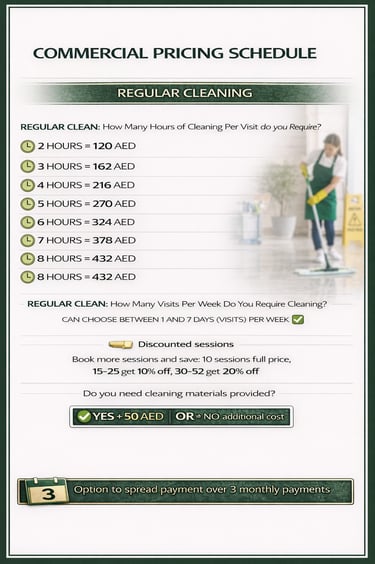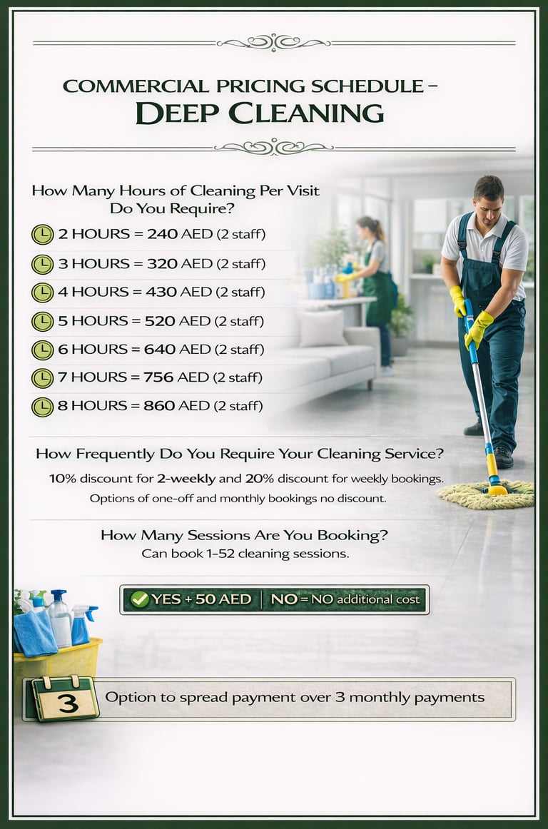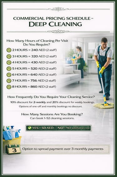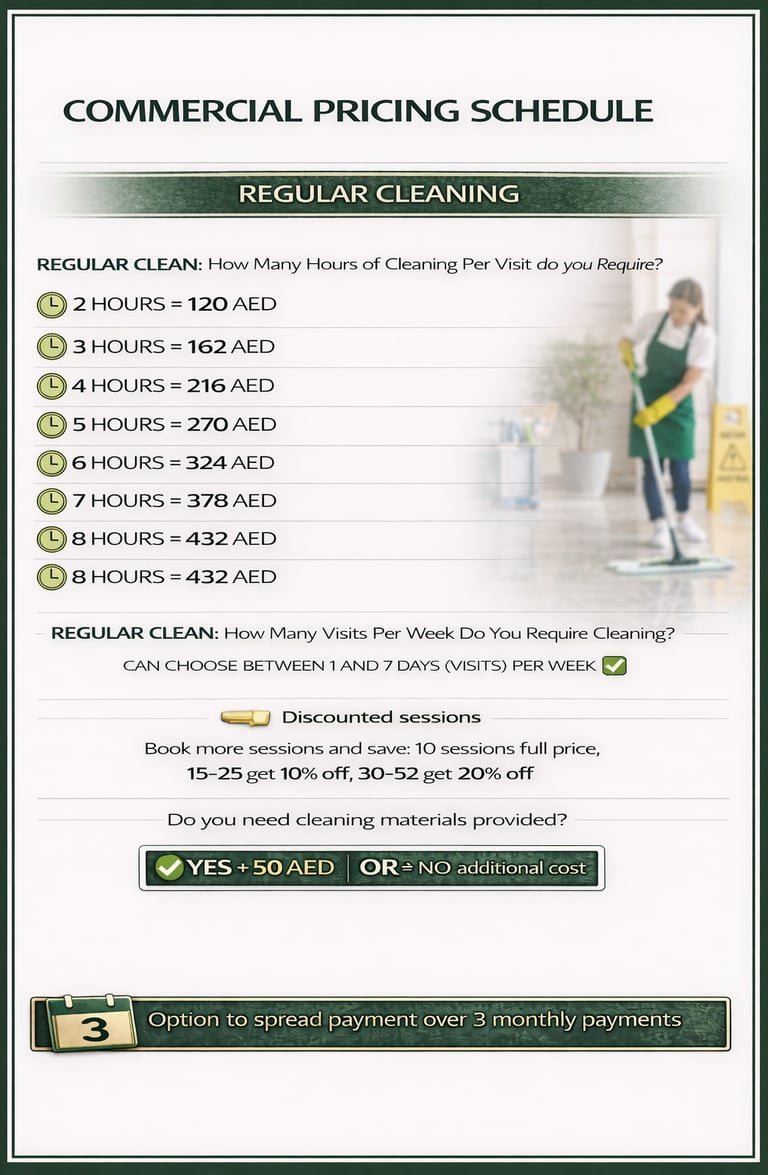 Our Commercial Cleaning services support businesses across Dubai with reliable, professional cleaning that maintains high standards of hygiene, presentation, and safety. We work with offices, retail spaces, restaurants, cafés, gyms, and other commercial environments, delivering tailored cleaning plans to suit your operational needs — from daily maintenance to scheduled deep and specialist cleaning.